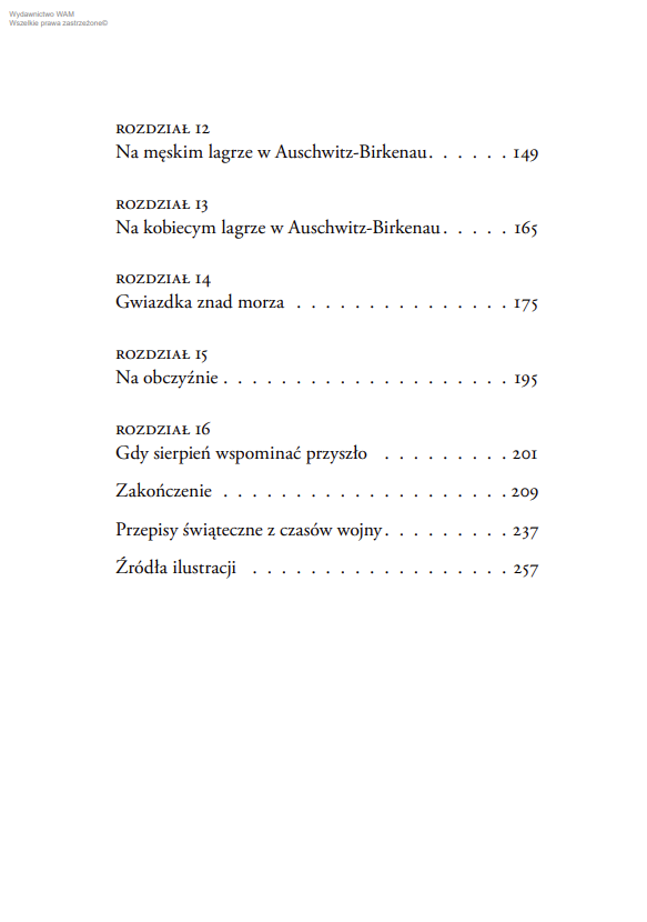 Nastała noc. Jak każda inna obozowa noc. Zaczął prószyć śnieg, opadał na zbroczone ludzką krwią grudy ziemi. Na dachy baraków i krematoriów. Biały, czysty i piękny. Nieskalany. Bóg się rodził, choć nam było bardzo źle. Wtedy ostatni raz przyszedł na świat w okupowanej przez Niemców Polsce. Nasza nadzieja, że przyjdzie nowe, lepsze życie, ziściła się. Doczekałyśmy wolności.
