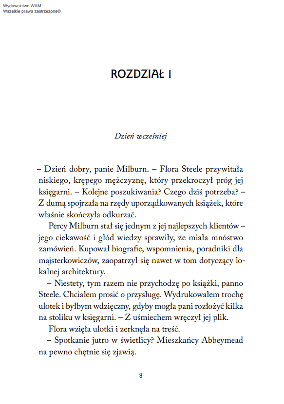 Kiedy Jack pracuje nad pierwszym rozdziałem nowej powieści, co zawsze idzie mu z trudem, Flora doskonale wie, że lepiej mu nie przeszkadzać. Jednak zaginięcie nowego mieszkańca wioski sprawia, że musi złamać tę niepisaną zasadę. Razem ruszają na jego poszukiwania. Niestety, nie odnajdują go żywego...