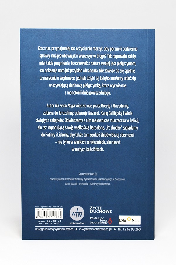 Autor Na ziemi Boga wiedzie nas przez Grecję i Macedonię, zabiera do Jerozolimy, pokazuje Nazaret, Kanę Galilejską i wiele świętych zakątków. Odwiedzamy z nim malownicze miasteczka w Galicji, ale też imponującą swoją wielkością Barcelonę. "Po drodze" zaglądamy do Fatimy i Lizbony, aby także tam szukać śladów Bożej obecności - nie tylko w wielkich sanktuariach, ale nawet w małych kościółkach.