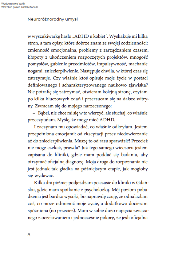 Diagnoza może przynieść ulgę i nadzieję, ale często też rodzi niepewność, zagubienie oraz mnóstwo pytań. Ta książka jest kompasem dla osób stojących na progu nowej rzeczywistości, która rozpoczęła się w jednym z bardziej przełomowych momentów w ich życiu – w chwili otrzymania diagnozy autyzmu, ADHD lub innej formy neuroróżnorodności. Wewnętrzy świat osoby neuroróżnorodnej to emocje, refleksje, procesy tożsamościowe, które składają się na codzienne, niewidzialne wyzwania.