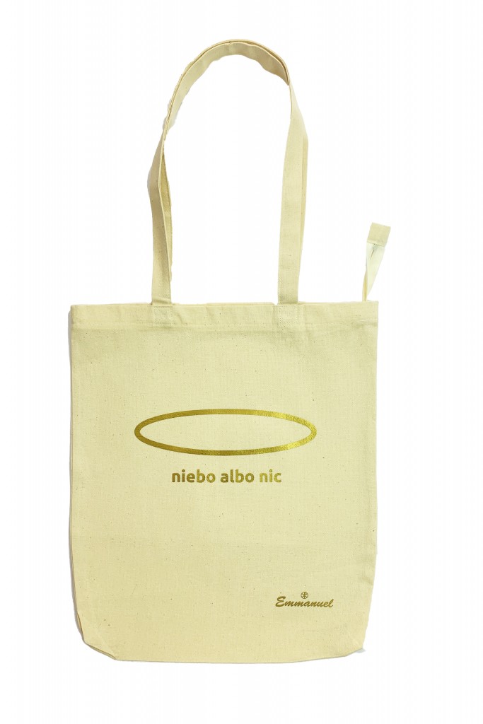 Bawełniana jasna torba z długimi uchami. Na torbie znajduje się nadruk: Niebo albo nic.
