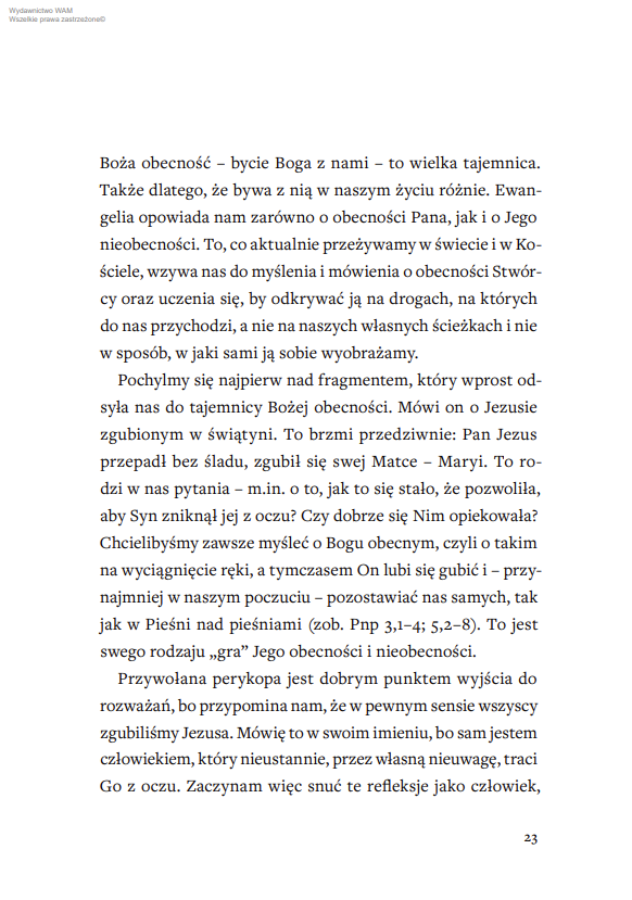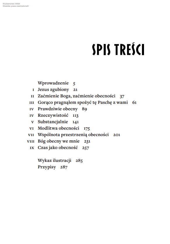 Bóg jest wszechobecny. Wierzymy w to, ale w codzienności, pełnej trosk i pośpiechu, mało kto doświadcza, że to właśnie „w Nim żyjemy, poruszamy się i jesteśmy”. Trudno nam uwierzyć w Obecność, która jest niezmienna, uważna na każdego człowieka, a do tego nieskończenie miłująca. Ksiądz Robert J. Woźniak, wybitny teolog, towarzyszy czytelnikom w odkrywaniu konkretnych przestrzeni, w których Bóg jest z nami. Nie ogranicza się pod tym względem jedynie do tematu Kościoła, liturgii czy modlitwy. Przypomina, że zwłaszcza eucharystyczna obecność Chrystusa między nami – prawdziwa, rzeczywista i substancjalna – jest dla nas szczególnym oparciem i paradoksalnie to właśnie ona pozwala pośrodku życiowego zabiegania odzyskać kontakt z realnością.