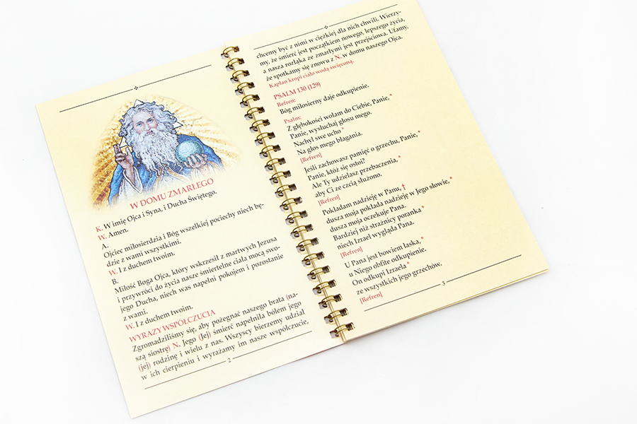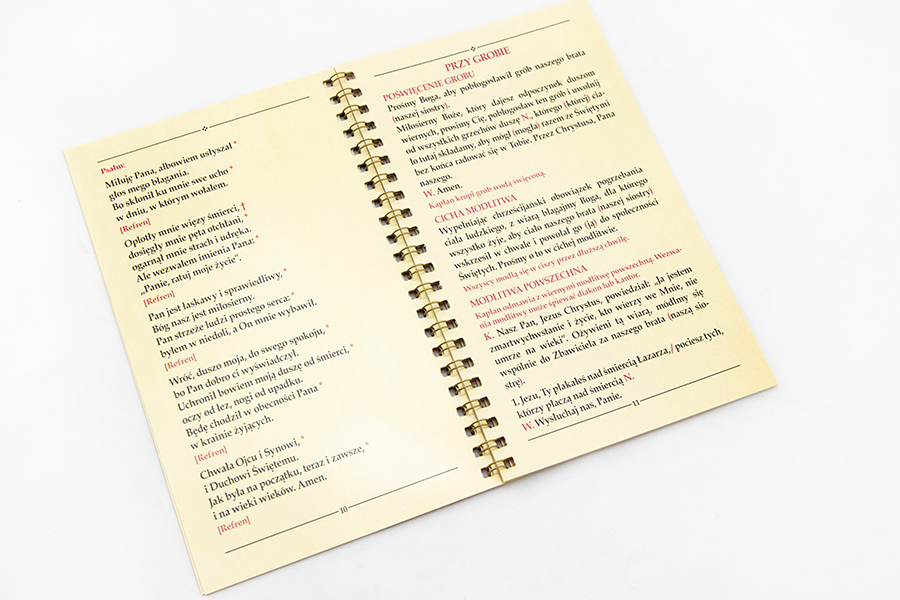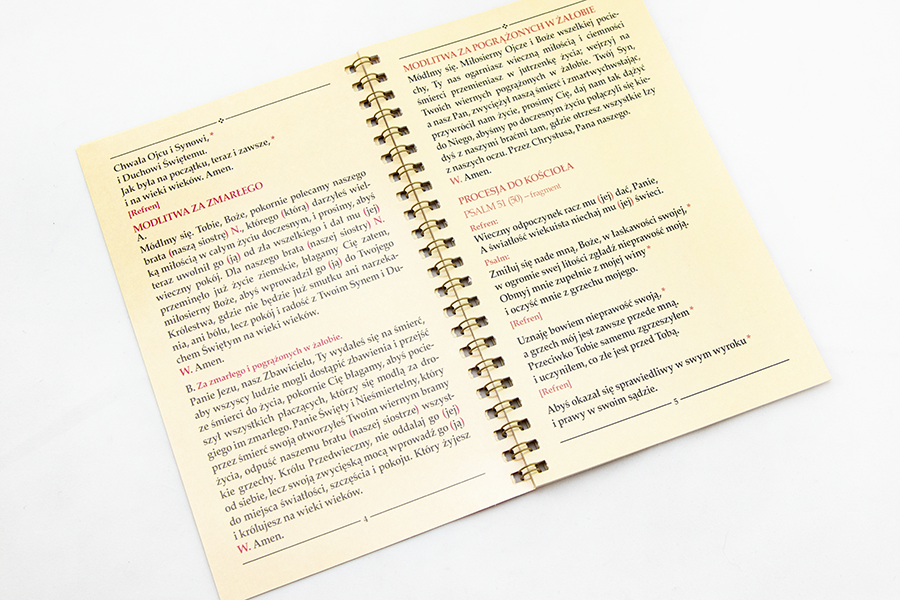 Publikacja uwzględniają obok tradycyjnego pochówku, także złożenie urny w grobie. Praktyczna forma, zszyta spiralą ułatwiającą użycie podczas ceremonii. Kartki foliowane, odporne na zamoknięcie.