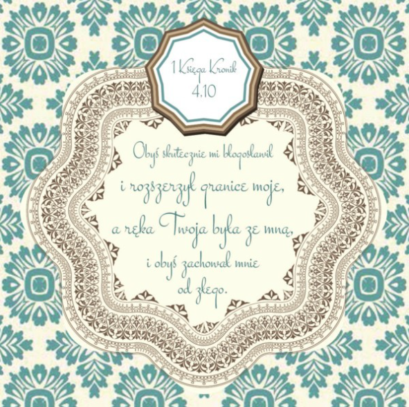 Napis: Obyś skutecznie mi błogosławił i rozszerzył granice moje, a ręka Twoja była ze mną i obyś mnie zachował od złego. 1 Krn 4,10