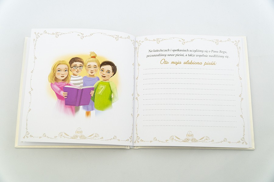 Bogato ilustrowany albumik jest idealną pamiątką dla dzieci z okazji Pierwszej Komunii Świętej. W środku można zamieścić zdjęcia z uroczystości, jak i wpisać najważniejsze wydarzenia i informacje z życia. A wszystkiemu towarzyszą modlitwy, wiersze i słowa Jana Pawła II.