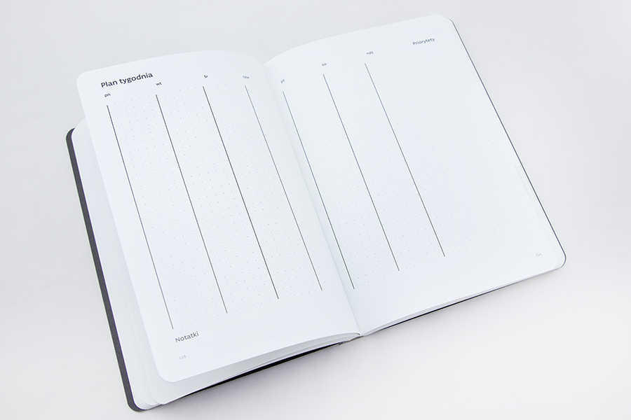 Planner nie ma wpisanych konkretnych dat (uzupełnisz je sobie sam), niezależnie od tego, kiedy zaczniesz, zawsze wystartujesz we właściwym czasie. Został skonstruowany tak, aby korzystać z niego przez 12 tygodni (ok. 3 miesiące), które zostały podzielone na 6 cykli. Każdy cykl trwa 2 tygodnie i poprzedzony jest „rozkminą”, która podejmuje za każdym razem inny ważny, interesujący i rozwojowy temat.
