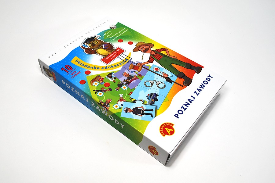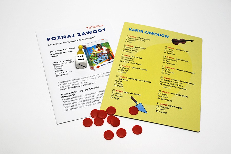 "Poznajemy zawody" to gry i zabawy, a także pomoc dydaktyczna dla dzieci w wieku przedszkolnym. Warianty zabawy, podczas których należy skojarzyć obrazki, dostarczają dzieciom wiadomości na temat różnych zawodów i narzędzi potrzebnych do ich wykonywania. Rozwijają umiejętność samodzielnej wypowiedzi, koncentrację, logiczne myślenie, pamięć, wyobraźnię oraz sprawność manualną. Dzieci mogą bawić się indywidualnie lub w większym gronie. Bardzo pomocny przy zabawie może być dorosły opiekun, który wyjaśni prawidłowo jej zasady i zwróci uwagę na jej prawidłowy przebieg.