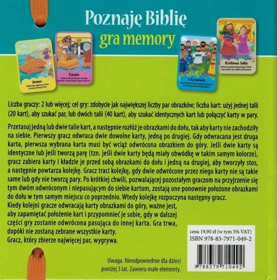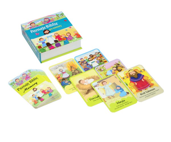 To niezwykle lubiana przez dzieci gra memory, na którą składa się 20 par obrazków (umieszczonych w praktycznym i kolorowym pudełku) przedstawiających biblijne sceny. Znajdziemy tu m.in. historię Jonasza i Józefa, przyjrzymy się Zwiastowaniu Panny Maryi, Narodzeniu Jezusa czy przypowieści o zagubionej owcy.