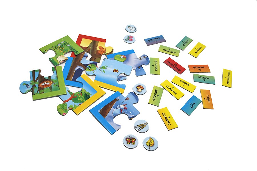 W tej grze, oprócz planszy, pionków i kostki, wykorzystuje się wiele innych atrakcyjnych rekwizytów - między innymi puzzle, na których przedstawione są 4 pory roku. Dla dzieci bardzo cenne jest to, że podczas gry i zabawy uczą się nazw i kolejności miesięcy oraz ich związku z następującymi po sobie porami roku. To samo dotyczy dni tygodnia, których nauka wynika z zasad gry.