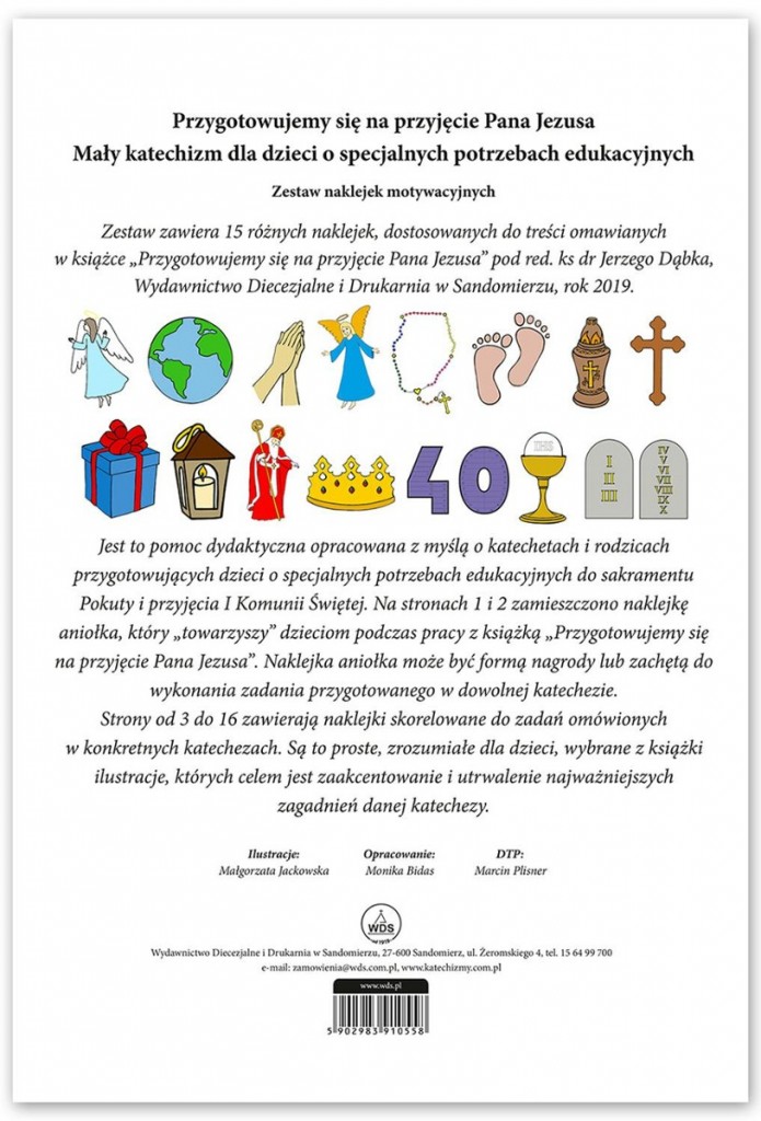 Naklejki dostosowane są do treści omawianych w książce „Przygotowujemy się na przyjęcie Pana Jezusa” pod red. ks dr Jerzego Dąbka. Jest to pomoc dydaktyczna opracowana z myślą o katechetach i rodzicach przygotowujących dzieci o specjalnych potrzebach edukacyjnych do sakramentu pokuty i przyjęcia I Komunii Świętej.