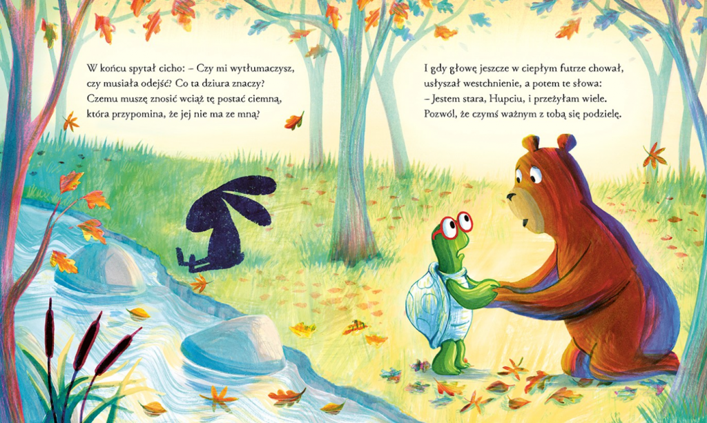 Kiedy pewnego dnia Tupcia nagle znika, Hupcio jest zrozpaczony. Widzi tylko ciemną dziurę w kształcie zająca, tam gdzie nadal powinna być jego najlepsza przyjaciółka. Błaga, złości się, chciałby przepędzić tę najczarniejszą w świecie dziurę i odzyskać Tupcię. Ale jak ma to zrobić? Wszystko wydaje się stracone... aż pojawia się niedźwiedzica Gerda, której czułe i mądre słowa dodają Hupciowi otuchy. I smutny żółw powoli zaczyna się uśmiechać…