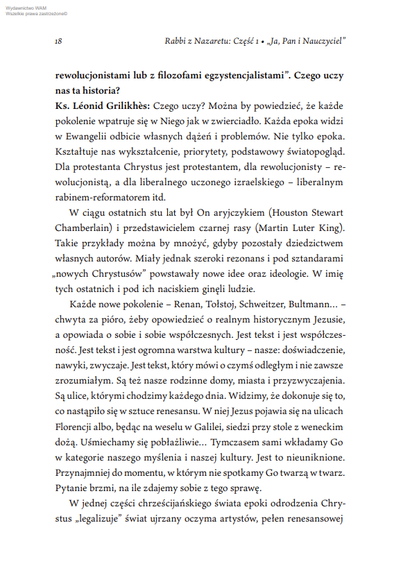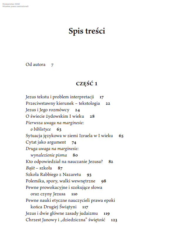 Ojciec Léonid Grilikhès, wybitny biblista i tłumacz, przybliża fascynujący świat judaizmu I wieku naszej ery, w którym dorastał i kształtował się Jezus z Nazaretu. Zabiera nas do świata synagog i pielgrzymek do świętego miasta – Jeruzalem, wprowadza w środowisko uczonych w Piśmie i faryzeuszy. Opisuje czasy, w których miłość do Tory miała szczególne znaczenie. Pokazuje zarazem wyjątkowość przesłania Nazarejczyka na tle historii i tradycji ówczesnego Izraela.