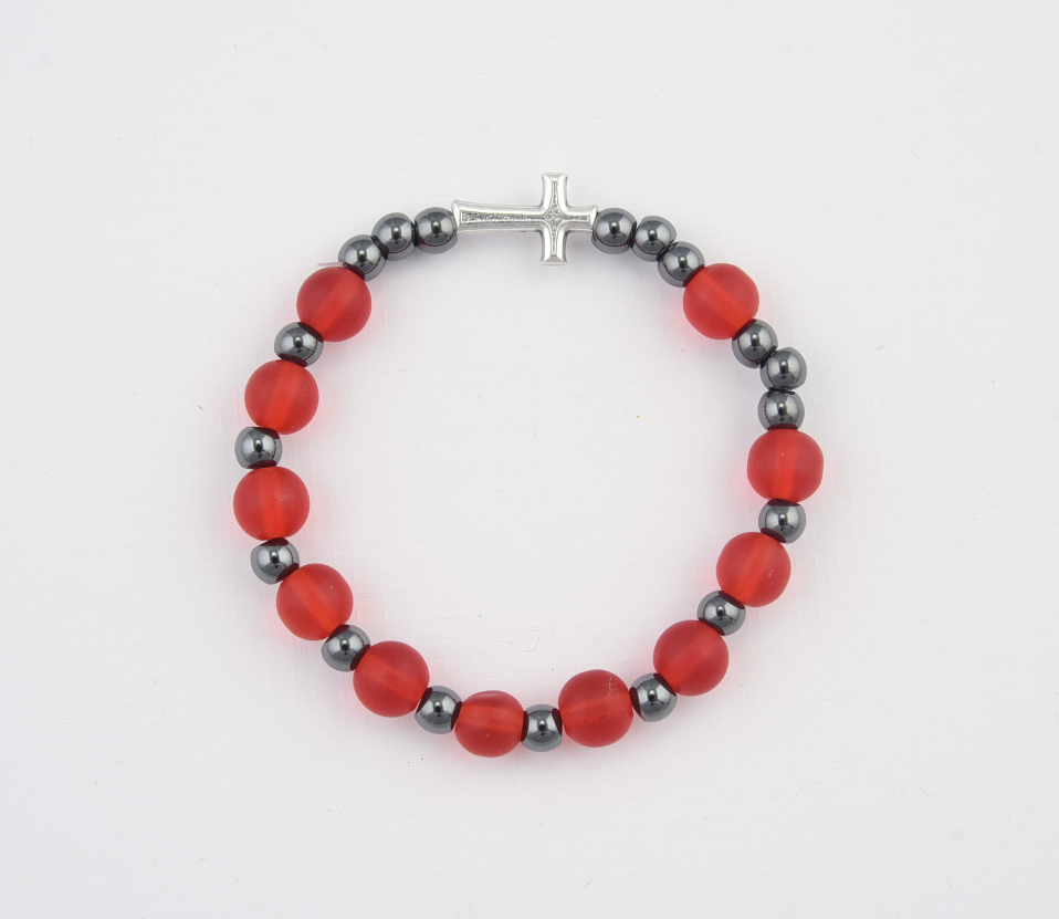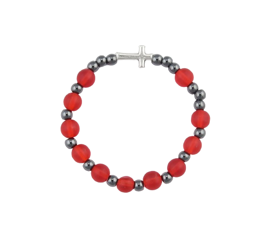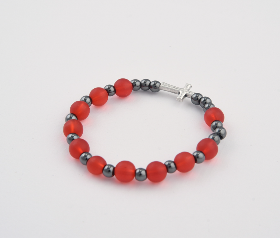 Różaniec - bransoletka z koralikami w kolorze czerwonym, z krzyżykiem.