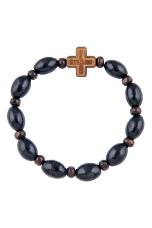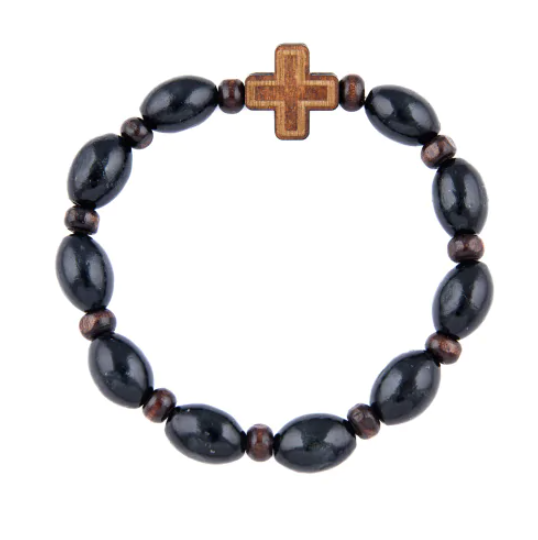 Różaniec wykonany z drewna, na gumce, można nosić jako bransoletkę.