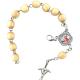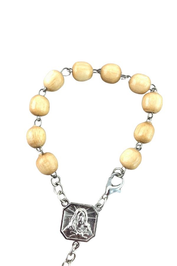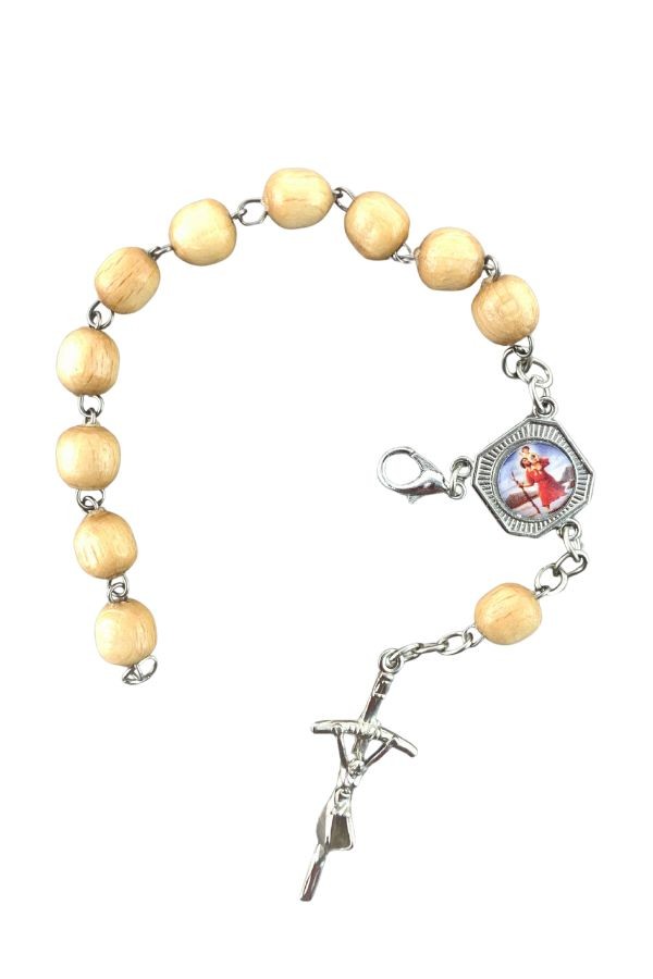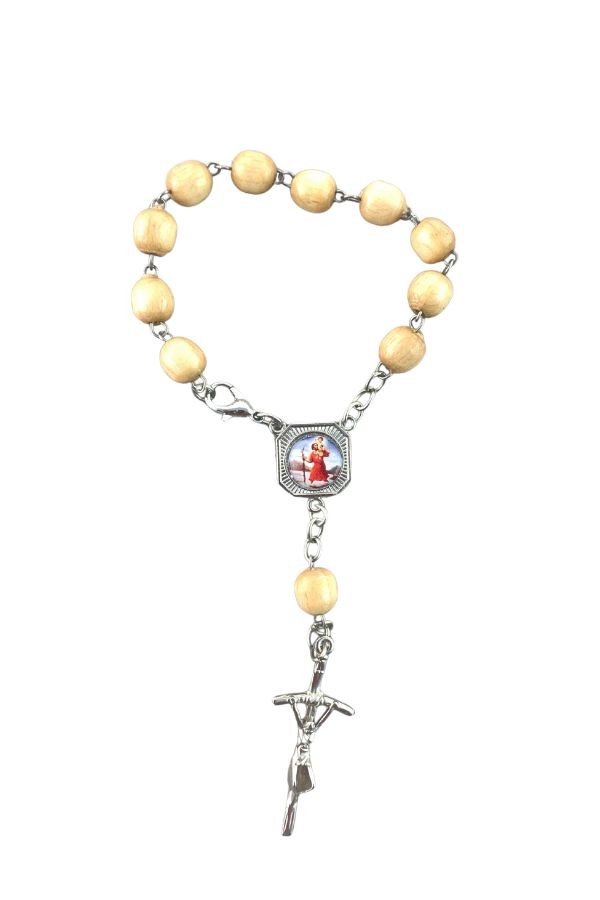 Różaniec ze Świętym Krzysztofem został wykonany z 10 drewnianych koralików zespolonych za pomocą metalowych ogniw w srebrnym kolorze. Dodatkowo wyposażono go w zapinkę, co pozwala rozpiąć go i zahaczyć o lusterko samochodowe. W ten sposób prezentuje się niezwykle elegancko i jednocześnie jest trwały – odporny na uszkodzenia, działanie czynników zewnętrznych czy zerwanie.