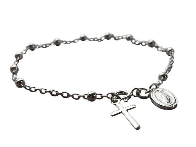 Różaniec srebrny – bransoletka – wykonany ze srebra próby 0,925. Zawiera medalik z wizerunkiem Matki Boskiej oraz krzyżyk.