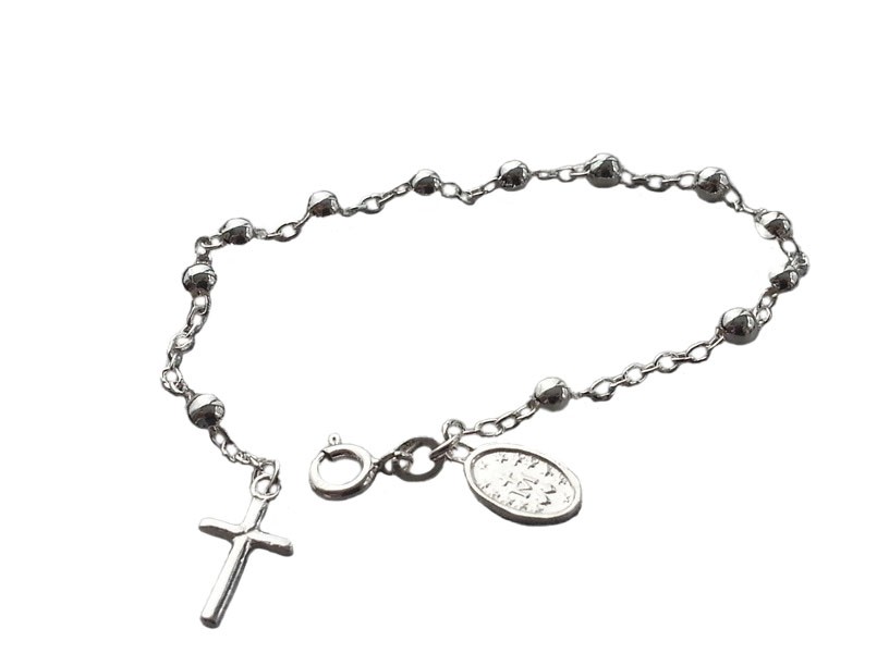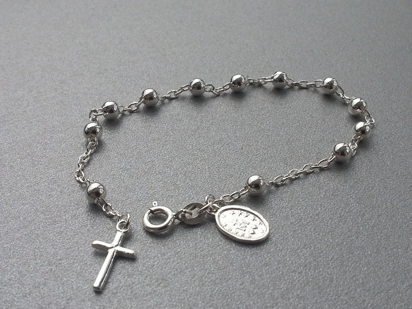 Różaniec srebrny – bransoletka – wykonany ze srebra próby 0,925. Zawiera medalik z wizerunkiem Matki Boskiej oraz krzyżyk.
