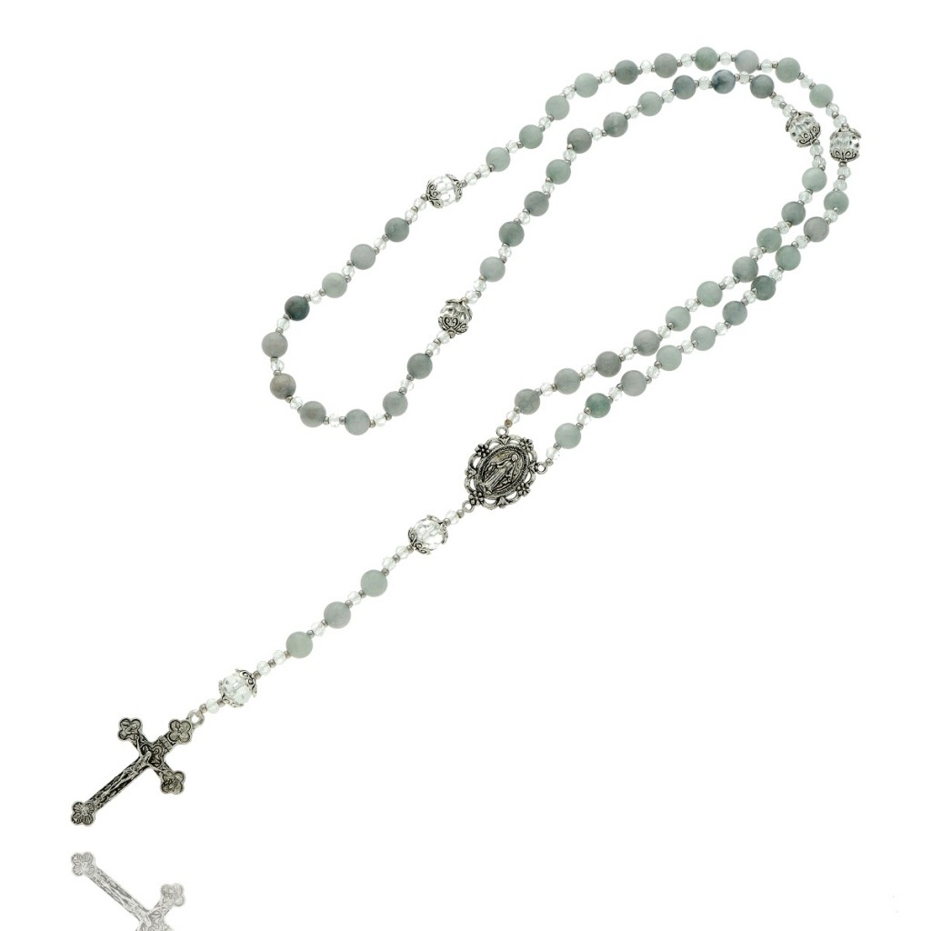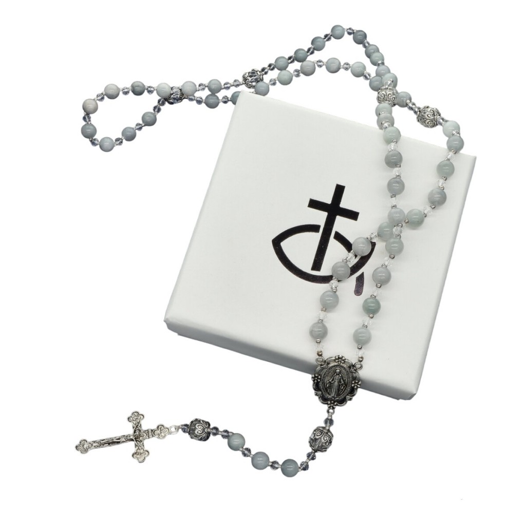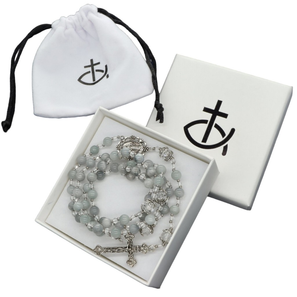 Różaniec z kamieni naturalnych, na rozciągliwej żyłce, w eleganckim pudełeczku, w zestawie z sakiewką do przechowywania. Stal szlachetna i kamienie naturalne (jadeit szary).