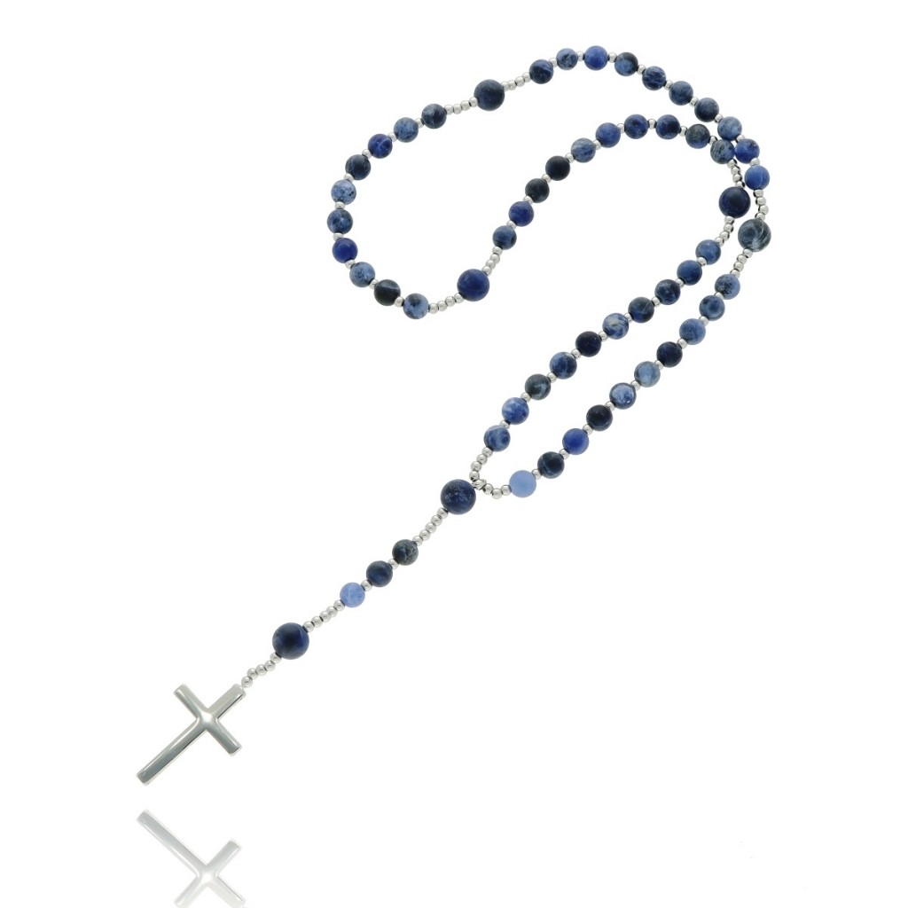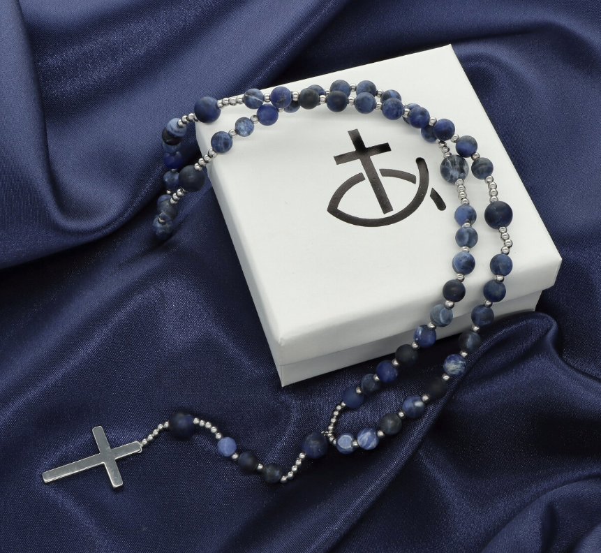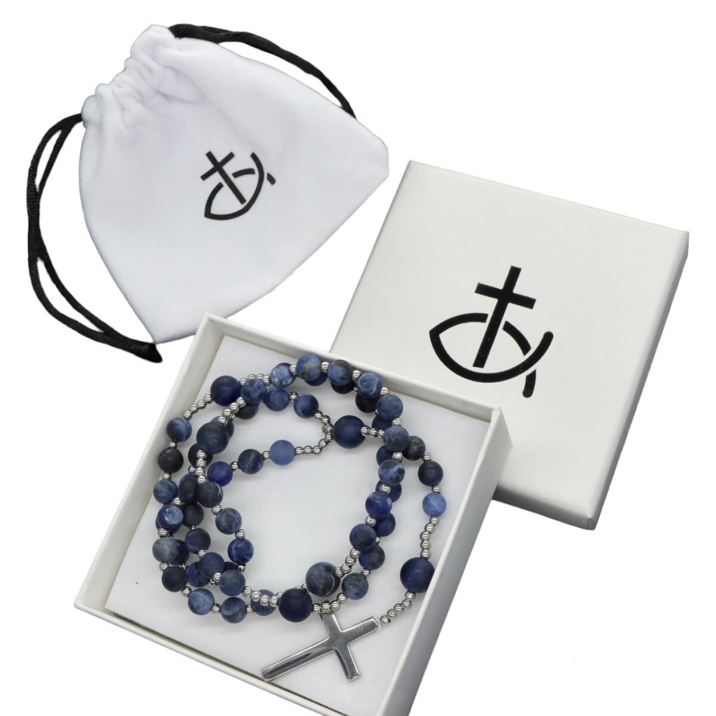 Różaniec z kamieni naturalnych, na rozciągliwej żyłce, w eleganckim pudełeczku, w zestawie z sakiewką do przechowywania. Stal szlachetna i kamienie naturalne (sodalit).