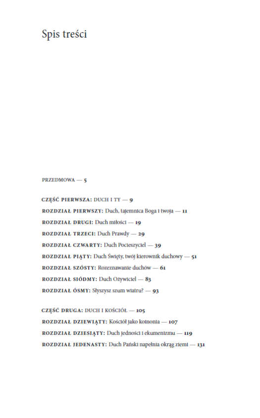 Jeśli nie zadowala cię życie na zwolnionych obrotach, pragniesz żyć pełnią – potrzebujesz Ducha. Nie sądź, że jest On gdzieś daleko. Odkąd tchnienie Boże sprawiło, że człowiek stał się istotą żyjącą, żyjemy życiem samego Boga. W ogóle istniejesz dlatego, że Żyjący podarował ci swego Ducha. Czy nie chcesz żyć świadomie, czy nie chcesz bardziej żyć? Duch wieje za pośrednictwem ciebie i Kościoła tak samo dzisiaj, jak u początków istnienia. Czy jednak słyszysz Jego tchnienie? (Fragment Przedmowy)