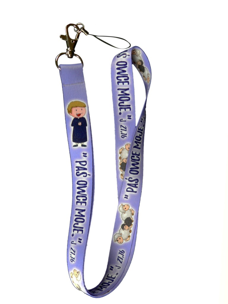Smycz z rysunkiem postaci księdza i napisem: Paś owce moje.