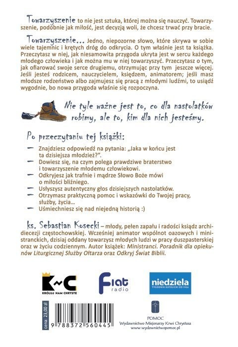 Towarzyszenie... Jedno, niepozorne słowo, które skrywa w sobie wiele tajemnic i krętych dróg do odkrycia. O tym właśnie jest ta książka. Przeczytasz w niej, jak niesamowita przygoda ukryta jest w sercu każdego młodego człowieka i jak można mu w niej towarzyszyć. Przeczytasz o tym, jak ofiarować swoje serce drugiemu, otrzymując przy tym jeszcze więcej. Jeśli jesteś rodzicem, nauczycielem, księdzem, animatorem; jeśli masz młodsze rodzeństwo albo zajmujesz się pracą z młodymi ludźmi, to usiądź wygodnie, bo nowa przygoda właśnie się rozpoczyna.