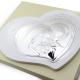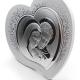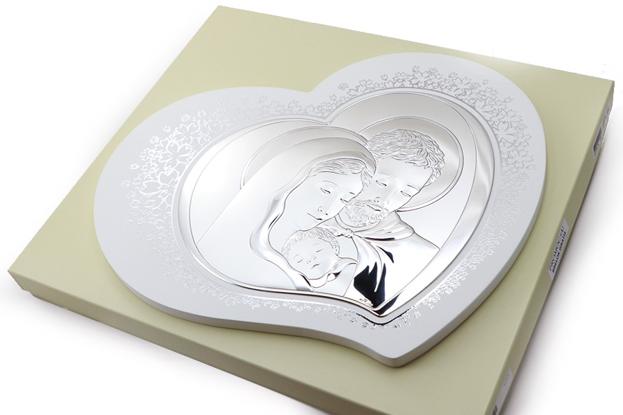 Obrazek srebrny na białym drewnie przedstawiający wizerunek Świętej Rodziny.