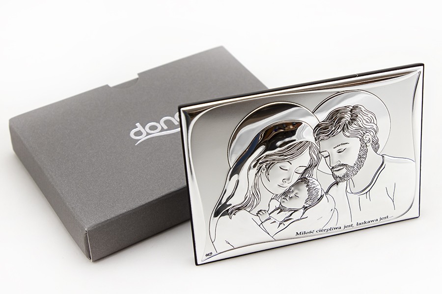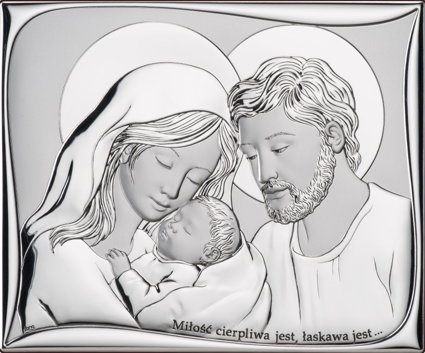 Obrazek srebrny przedstawiający wizerunek Świętej Rodziny z napisem: