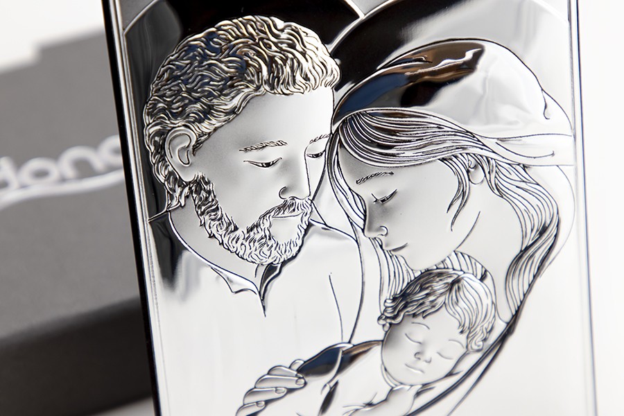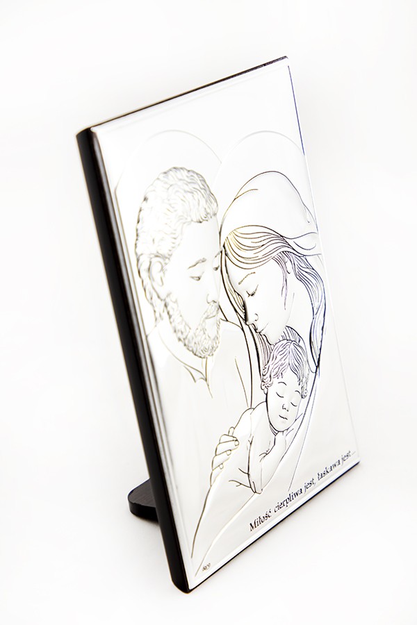 Obrazek srebrny przedstawiający wizerunek Świętej Rodziny z napisem: