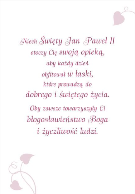 Kartka z wizerunkiem świętego to doskonała okazja, by w wyjątkowy sposób życzyć bliskiej osobie opieki św. Jana Pawła II – z okazji urodzin, imienin, bierzmowania, chrztu, I Komunii Świętej, a także jako duchowe wsparcie w trudnym czasie czy ważnym momencie życia.