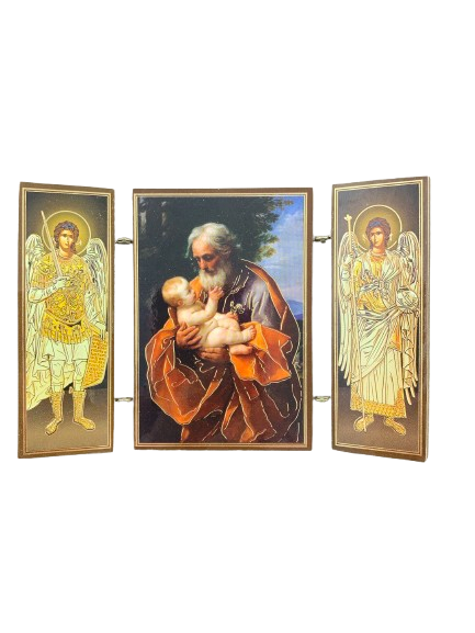 Drewniany tryptyk wykonany na desce; w centrum wizerunek Świętego Józefa z Jezusem, po bokach wizerunek Archaniołów Michała i Gabriela.