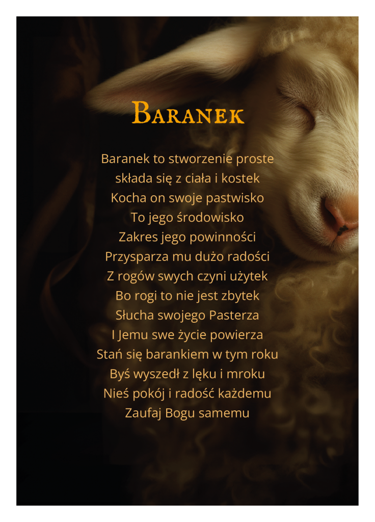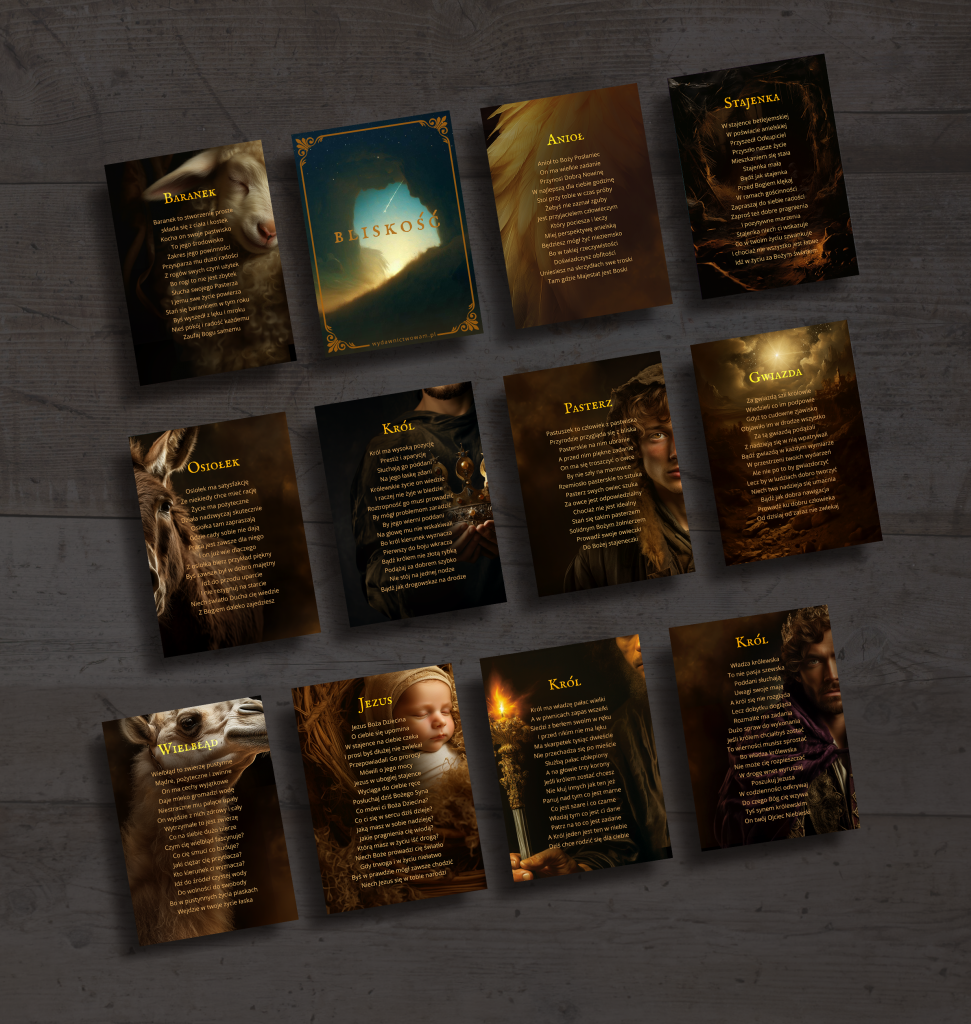 Propozycja, którą przedstawiamy, to świąteczna zabawa, którą można przeprowadzić podczas wigilijnego wieczoru, jak również w czasie spotkań we wspólnotach czy z przyjaciółmi w okresie bożonarodzeniowym. Są to karty, na których w formie wiersza Autor opisał postacie ze stajenki. Uczestnicy losują po jednej karcie z zestawu, a następnie każda z osób czyta na głos to, co wylosowała. Czytane słowa wierszy stają się inspiracją do podzielenia się swoimi uczuciami, radością z przeżywania świąt. Można także potraktować je jako zadanie na nadchodzący rok.