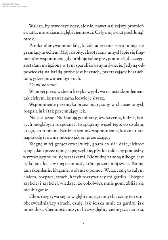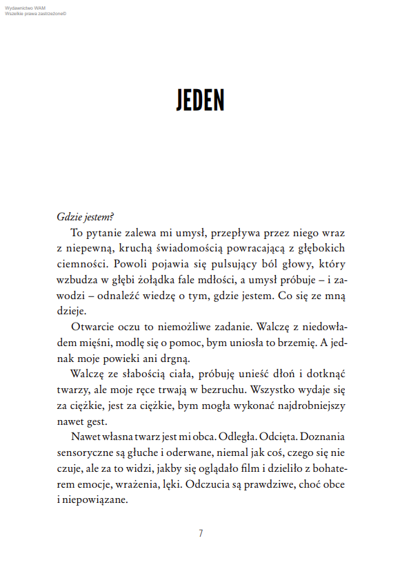 Pod opieką lekarza i pielęgniarek zaczynam sobie przypominać urywki ze swojej przeszłości. Wspomnienia wracają powoli, kawałek po kawałku. Widzę fragmenty dawnego życia: karierę, męża, przyjaciółki, wielką miłość. Najważniejsze pytanie wciąż jednak pozostaje zagadką. Kto był oprawcą? I dlaczego chciał mnie zabić?