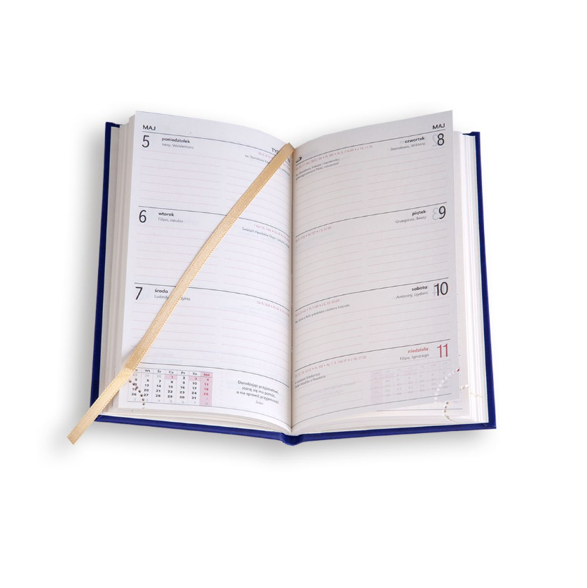 Organizer na rok 2026, papier chamois, druk wnętrza w dwóch kolorach, perforowane narożniki kartek, tasiemka, tydzień na dwóch stronach, imieniny, święta, patron dnia, informacja o liturgii dnia, myśl na każdy tydzień, miejsce na notatki, skrócone kalendarium miesiąca bieżącego, skrócone kalendarium na kolejny rok.