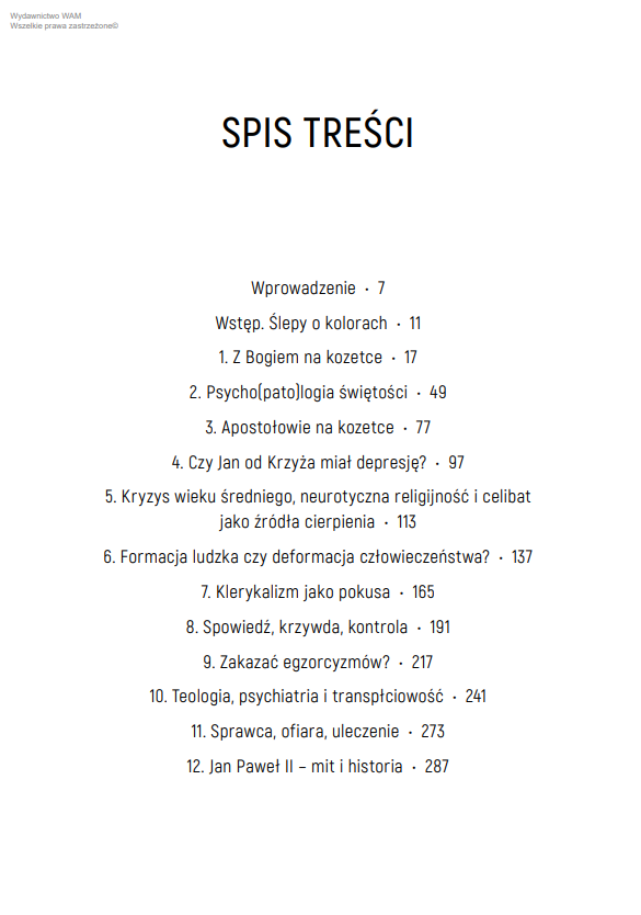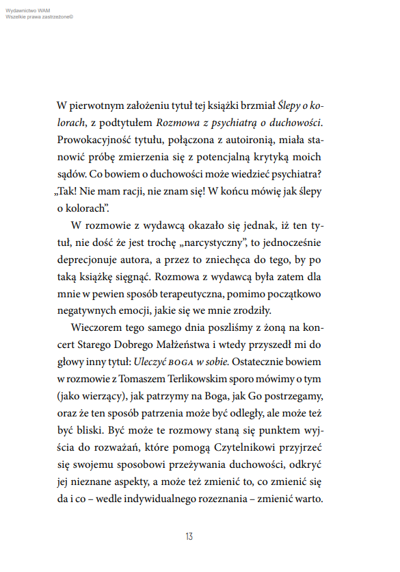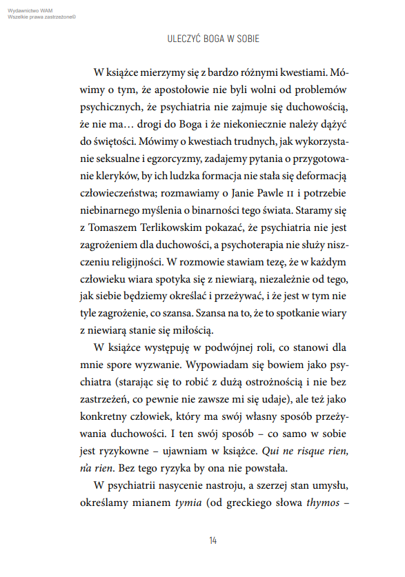 Tomasz Terlikowski, filozof, publicysta, rozmawia z dr. hab. Krzysztofem Krajewskim-Siudą, psychiatrą i psychoterapeutą, o problemach z pogranicza duchowości i zdrowia psychicznego. Psychiatra wciąż jest w powszechnym odbiorze lekarzem z obszaru tajemnicy, świata fascynującego i przerażającego zarazem. Styka się z psychozami, urojeniami, zaburzeniami lękowymi, często na tle religijnym. Okazuje się, że wiedza z obszaru medycyny i psychologii pomaga nam zrozumieć nie tylko to, co przynależy do obszaru patologii duchowości, ale także to, co z naszej religijności zdrowe i potrzebne. Warto wiedzieć, w co wierzymy – mówił śp. Benedykt XVI – i ta książka zdecydowanie w tym pomaga.