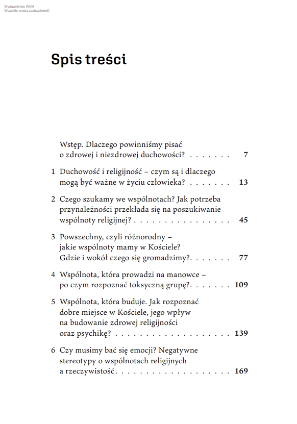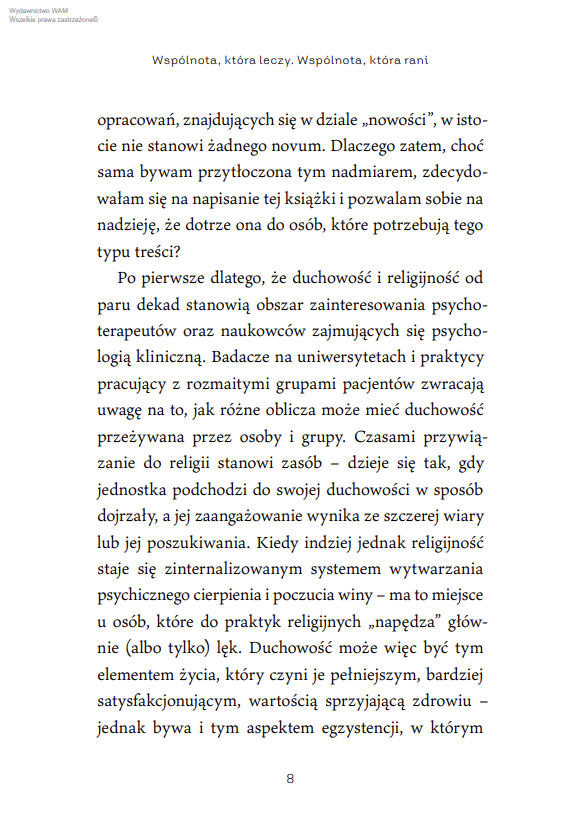 Angelika Szelągowska-Mironiuk, doświadczona psycholożka i terapeutka, pokazuje, że świadoma wiara nie odrzuca emocji, lecz włącza je w proces duchowego wzrastania. Obala stereotypy, które mówią o „niebezpiecznych uczuciach” a także te, które usprawiedliwiają różne formy nadużyć w grupach religijnych. Ujawnia mechanizmy manipulacji i wskazuje drogę do autentycznej, dojrzałej relacji z Bogiem i ludźmi.