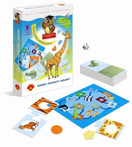"Wzory kształty kolory" to świetna zabawa i jednocześnie pomoc dydaktyczna dla dzieci w wieku przedszkolnym. Pudełko zawiera 12 kompletów puzzli, które składają się z trzech pasujących do siebie tematycznie obrazków. Warianty zabawy, podczas których należy na różny sposób skojarzyć obrazki, uczą dzieci koncentracji, rozwijają logiczne myślenie, pamięć, wyobraźnię oraz sprawność manualną. Dzieci mogą bawić się indywidualnie lub w większym gronie. Dobrze, jeśli w zabawie towarzyszy dzieciom opiekun, który wskazuje różne wersje zabawy i pomaga dzieciom w trudniejszych zadaniach.
