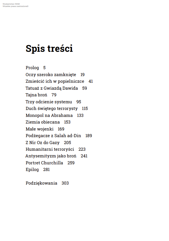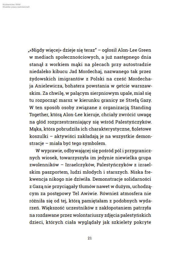 Karolina Wójcicka, dziennikarka „Dziennika Gazety Prawnej” i współautorka podcastu „Bliski Świat”, od lat zajmuje się wzajemnymi relacjami Izraela i Palestyny. W tej reporterskiej książce przygląda się Izraelczykom – zarówno tym, którzy popierają bombardowania, jak i tym, którzy wychodzą na ulice, protestując przeciw przemocy. Pokazuje, w jaki sposób Palestyńczycy są od lat dehumanizowani, zarówno w mediach, jaki i w systemie edukacji. Pomaga odkryć, jak do tego doszło, że większość narodu noszącego traumę Holokaustu patrzy na popełniane w Gazie zbrodnie wojenne z aprobatą lub obojętnością.