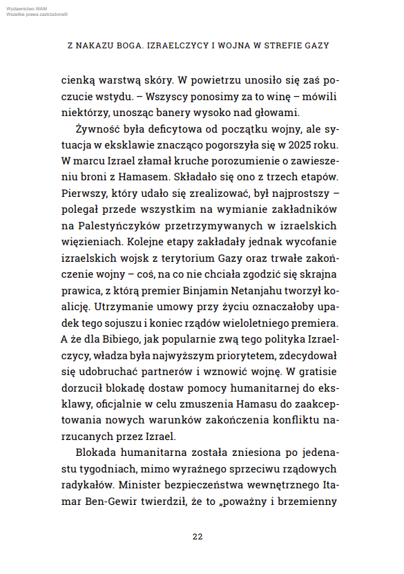 Wojna to nie tylko działania wojenne, ale też przekaz. Przypomina grę, w której ukryte cele przeplatają się z różnymi podważającymi fakty narracjami; manipulacje i zaprzeczenia potęgują chaos. Im dłużej trwała wojna Izraela w Strefie Gazy, tym więcej narracji powstawało. Karolina Wójcicka i bohaterowie jej książki porządkują wydarzenia, dając czytelnikowi wgląd w izraelską politykę, postawy, sposób myślenia, motywacje. Jak powiedział autorce izraelski badacz ludobójstwa prof. Omer Bartov: „świat w końcu zacznie uznawać fakty i zrozumie, co Izrael zrobił w Gazie”.