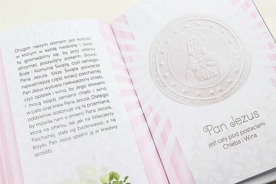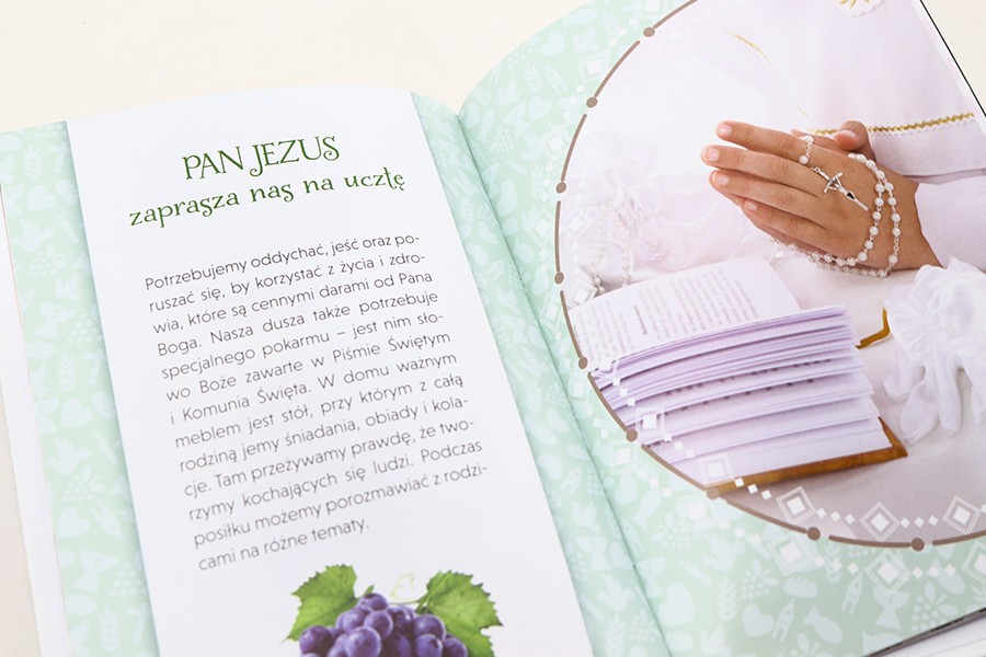 Dzień, kiedy dzieci po raz pierwszy w pełni uczestniczą w Eucharystii, przyjmując do swoich małych serc Pana Jezusa ukrytego w białej Hostii, zapada w pamięć na całe życie. Wie o tym dobrze biskup od dzieci Antoni Długosz, który z myślą o utrwaleniu tych chwil na długie lata przygotował wyjątkową książeczkę. Znajdziemy tu wiele cennych, przystępnie wyjaśnionych informacji na temat znaczenia sakramentu, a także przebieg nabożeństwa rodzinnego przed wyjściem do kościoła i po powrocie. Wszystko po to, by uczynić ten dzień przede wszystkim radosnym spotkaniem z Panem Jezusem. Atutem tego albumu jest piękna szata graficzna, format, który bez problemu można zabrać na uroczystość, miejsce na podpis pod życzeniami oraz luźno dołączona koperta.