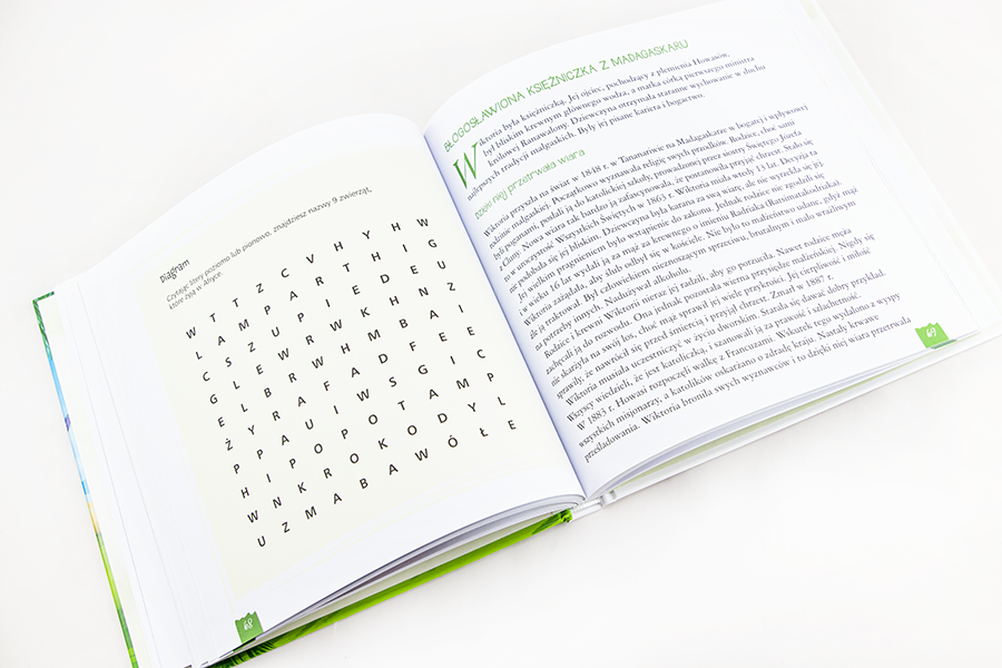 Ta piękna i ciekawa książka zaprasza małych chrześcijan, dziewczynki i chłopców, na wielką wyprawę misyjną. Przewodnikami na drodze głoszenia wszystkim ludziom Dobrej Nowiny o Panu Jezusie będą święci Kościoła katolickiego. W książce znajdziemy pasjonujące biogramy (Święta Tereska od Dzieciątka Jezus, Święty Franciszek Ksawery, Święta Róża z Limy, Święta Józefina Bakhita i wiele innych postaci) i mnóstwo ciekawych informacji na temat krajów misyjnych i posługujących tam misjonarzy. Dla ceniących dobrą zabawę i główkowanie na kolorowych stronach publikacji nie zabraknie quizów, zgadywanek i krzyżówek, dzięki którym wiele interesujących faktów w mig wpadnie do dziecięcych głów.