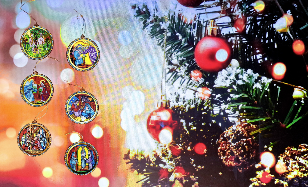 Zestaw zawiera sześć kolorowych, dwustronnie bombek z pięknymi grafikami przedstawiającymi historie biblijne, ozdobionymi delikatnymi, złoconymi detalami. Do zestawu dołączone są złote sznureczki do zawieszenia na choince.
