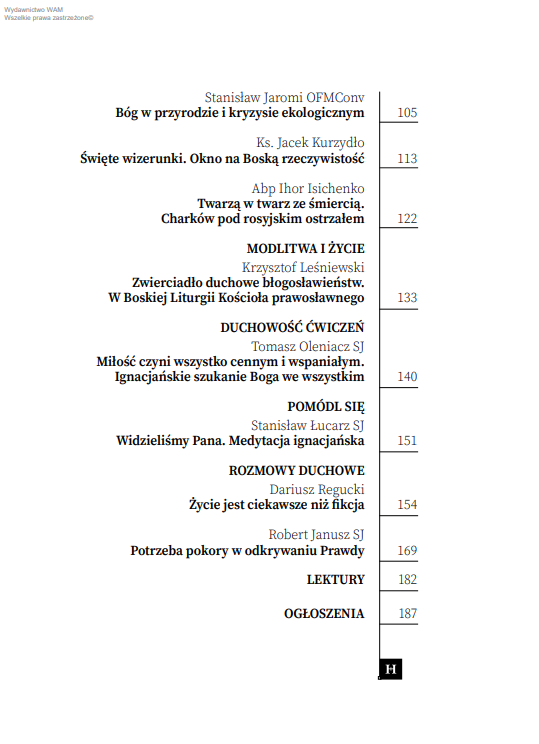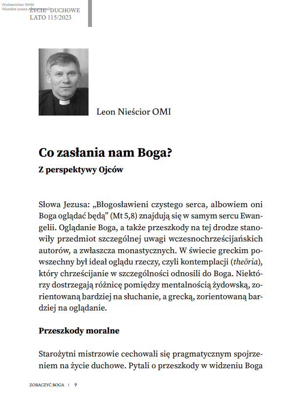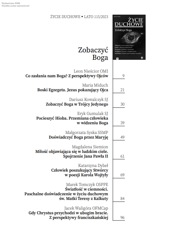 O sposobach owego uwidaczniania się oraz „widzenia” i doświadczania Boga przez człowieka piszą w numerze między innymi: Leon Nieścior OMI, odwołując się do perspektywy Ojców monastycznych; Maria Miduch, podkreślając, że nic nas nie zbliża do Boga tak jak Jezus i Jego dzieło; Dariusz Kowalczyk SJ w artykule o tym, jak zobaczyć Boga w Trójcy Jedynego; oraz Eryk Gumulak SJ przedstawiający, czym jest „widzenie Boga” w Księdze Hioba. W numerze zamieszczamy też dwie refleksje poświęcone twórczości Karola Wojtyły: Magdalena Siemion pisze o miłości objawiającej się w ludzkim ciele na podstawie teologii ciała Karola Wojtyły, a Katarzyny Dybeł – o człowieku poszukującym Stwórcy w poezji przyszłego papieża.